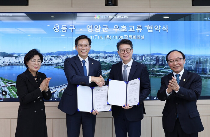 정원오 성동구청장도 “성동구와 영암군 모두 주민의 삶의 질을 높이고 미래 행정을 선도하려는 열망이 닮아 있다. 이번 우호 교류를 통해 서로의 고민을 나누고 협력해 지역 문제를 함께 해결하고, 지속 가능한 발전의 기반을 구축하자”고 화답했다.