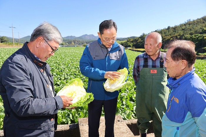 명현관 군수도 24일 마산면 배추 재배 농가 현장을 찾아 생육 상황을 점검하고, 수확기까지 철저한 관리를 통해 김장철 배추를 충분히 공급할 수 있도록 최선의 노력을 다해 줄 것을 지시했다.