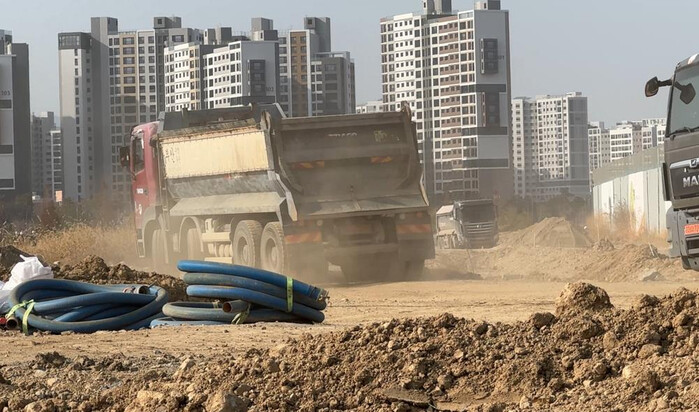 | ▲ 세륜 및 측면살수를 실시하지 않아 도로에 비산먼지를 다량 발생시키는 수송차량. |