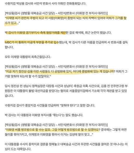 이어 “(하지만)‘서민석 변호사가 (전화로)먼저 ‘이화영 종범 의율’을 제안했고, 저는 안 된다고 거절하는 과정’이라고 (당시 상황을)수도 없이 설명했다”며 “그런데도 KBS는 이후 별도로 저에 대해 장시간 인터뷰를 하고서도 계속 기존의 ‘형량 거래, 자백 회유’ 프레임을 재생산해냈고 다른 언론사는 그 프레임을 받아쓰기에 혈안이 돼 있었다”고 비판했다.