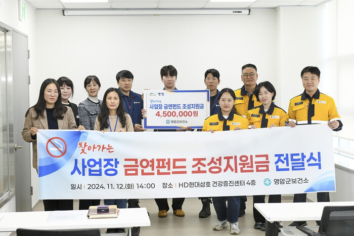 | ▲ 영암군 보건소 직원들이 지난 12일 HD현대삼호 건강증진센터에서 현대삼호 관계자 등에게 ‘찾아가는 사업장 금연펀드 조성지원금’ 전달 후 기념촬영 / 영암군 제공 |