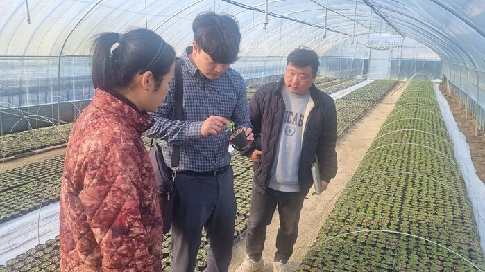 | ▲ 강진군 농업기술센터 관계자들이 지난 27일 칠량면 봄초화 위탁농가를 방문해 우량 꽃묘 생산을 위한 컨설팅을 실시하고 있다. / 강진군 제공 |