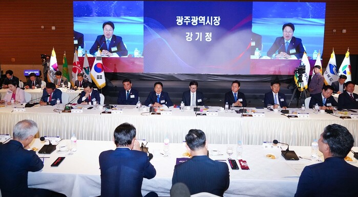 | ▲ 강기정 광주광역시장이 30일 오전 서울 여의도 한국경제인협회 FKI타워 컨퍼런스센터에서 열린 '영호남 시도지사-국회의원 상생협력 간담회'에 참석해 영호남 협력방안을 논의하고 있다./광주광역시 제공 |