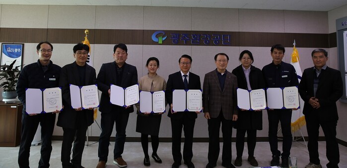 | ▲ 김병수 광주환경공단 이사장(오른 쪽부터 네 번째), 환경기초시설의 안정적인 운영을 위한 기술자문위원회 발족 및 위촉장 수여 후 기념촬영 / 광주환경공단 제공. |
