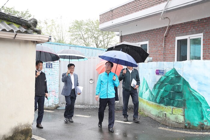 | ▲ 강진원 강진군수가 지난 14일 도시민 정주 인구 유입을 위해 빈집 리모델링 현장을 찾아 살펴보고 있다. / 강진군 제공 |