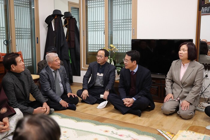 | ▲ 강진원 강진군수(오른 쪽부터 2번)가 지난 14일, 강진읍 남성리에 소재 수성당을 방문해 새해맞이 건강 안부 인사를 나누고 있다. / .강진군 제공 |