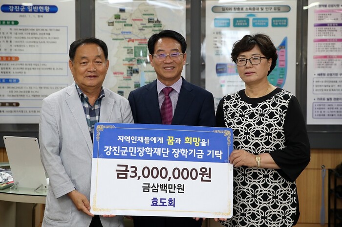 효도회(회장 마삼섭)는 2014년에 결성된 사회봉사단체로 총 300여 명의 회원이 활동 중이며, 이번 기탁을 포함해 현재까지 1,500만 원의 장학기금을 강진군민장학재단에 기탁했다.