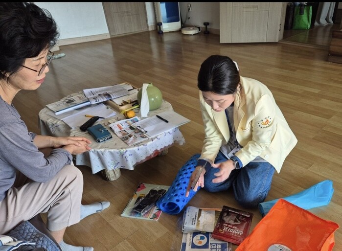 | ▲ 강진군 치매안심센터 관계자가 강진읍 목리마을의 한 가정을 방문해 ‘주거안전키트’ 를 배부하고 있다. / 강진군 제공 |