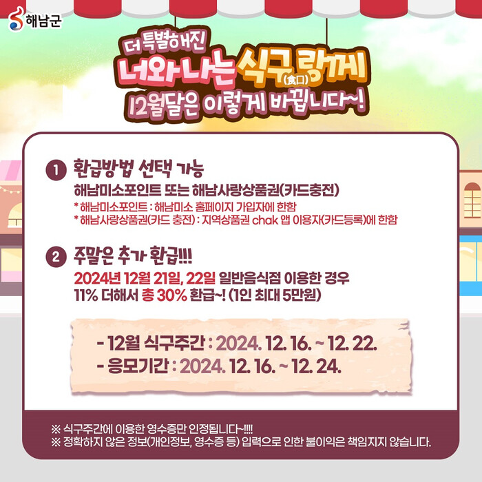 [해남=정찬남 기자] 전남 해남군이 미식관광과 관내 음식점 소비촉진을 위해 추진하고 있는 ‘너와 나는 식구(食口)랑께’ 이벤트가 연말을 맞아 더 특별해졌다.