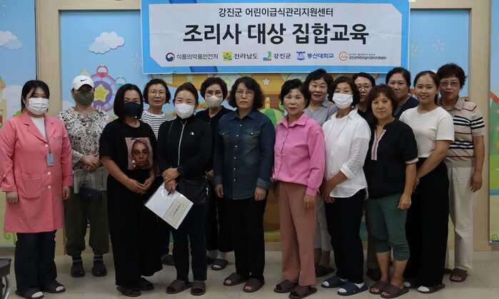 | ▲ 강진군 어린이급식관리지원센터, 지난 21일 센터 등록 어린이급식소 조리종사자 대상 조리사 집합교육 후 기념촬영 / 강진군 제공 |