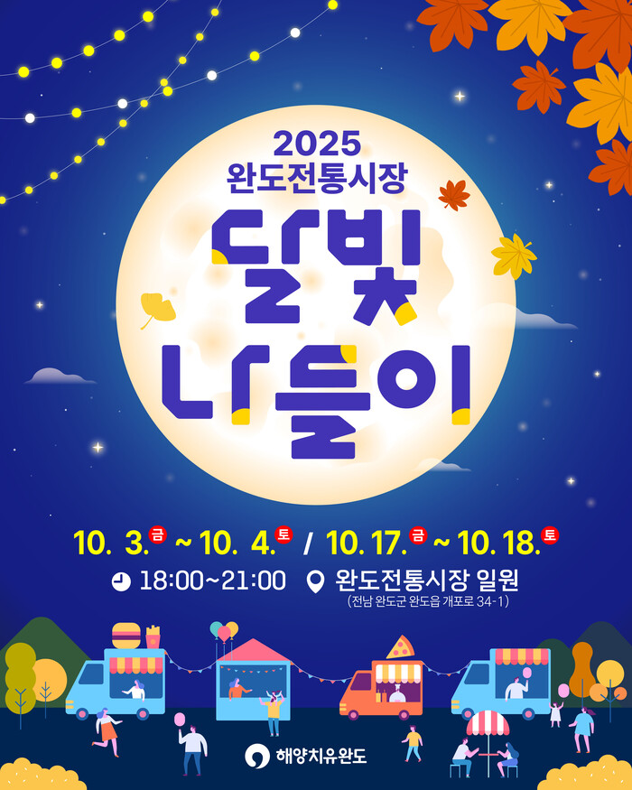 [완도=김현종 기자]완도군은 10월 첫째, 셋째 주 금·토요일 오후 6시부터 9시까지 총 4회에 걸쳐 완도전통시장에서 ‘달빛 나들이’ 행사를 개최한다.