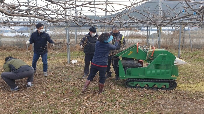 | ▲ 강진군 관내 과수농가, 영농부산물 잔가지 파쇄기 작업 / 강진군 제공 |