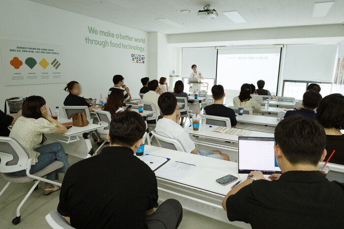 이번 연수의 주요 프로그램으로는 얌샘김밥 본사 방문이 포함돼 참가 교사들이 스마트 조리 시스템과 매장 자동화 운영 방식을 직접 체험했다. 얌샘깁밥 본사 측은 실제 매장에서 사용되는 자동화 조리 장비를 시연하고, 매뉴얼 기반의 조리 공정, 원팩(One-pack) 시스템, POS 데이터 분석을 통한 매장 운영 관리 방식 등을 소개해 디지털 기반 조리 환경에 대한 이해를 도왔다.