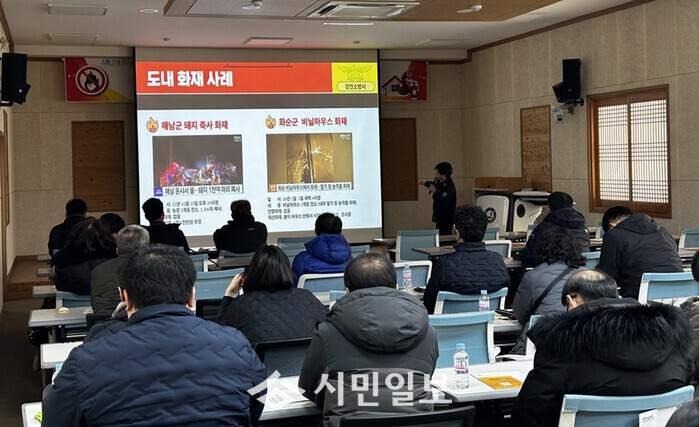 이날 교육은 강진소방서 소방장 윤슬빈이 강사로 나서 최근 발생한 축사 화재 사례를 공유하고, 화재 발생 시 119 신고 요령과 초기 대응 방법을 중심으로 진행됐다.