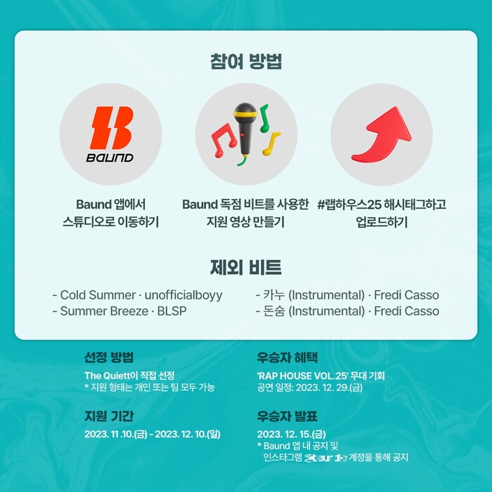Baund Open Mic는 바운드 앱 유저라면 누구나 지원할 수 있다. 본 이벤트는 랩하우스의 호스트 더콰이엇이 직접 모든 지원 영상을 확인하고 우승자를 선별할 예정이다. 우승자로 선정된 바운드 플레이어는 다가오는 12월 29일 홍대 플렉스라운지에서 열리는 ‘RAP HOUSE VOL.25’의 오프닝 무대에 출연해 본인의 무대를 선보이게 된다.