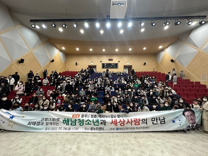 지난 14일 오후 해남교육청 꿈누리센터에서 열린 ‘2022 해남교육공동체와 세상 사람의 만남’을 주제로 개최된 이번 강의에는 관내 초ㆍ중‧고 학생, 학부모, 교직원 등 총 350여 명이 참여한 가운데 진행됐다.