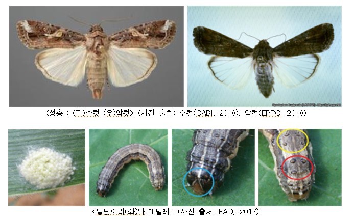 | ▲ 열대거세미나방 성장기 및 성충 모습 / 사진=강진군 제공 |