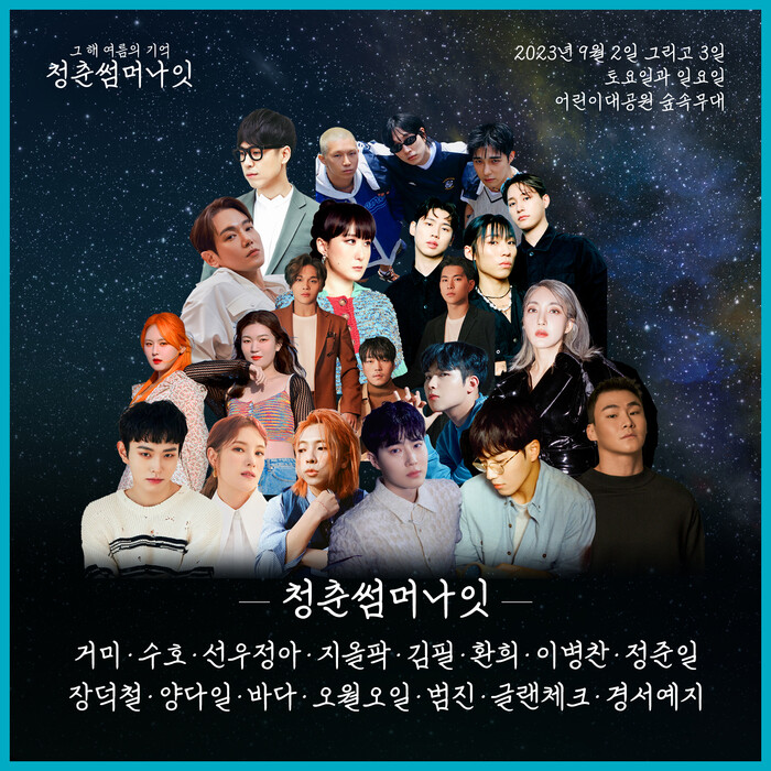 ‘청춘썸머나잇’은 우리의 여름, 우리의 추억이 아름답게 기억이 될 수 있도록 푸른 감성의 이야기와 노래가 펼쳐지는 페스티벌로 거미, 정준일, 바다, 환희, 장덕철, 이병찬, 오월오일, 범진, 지올팍, 김필, 양다일, 글렌체크, 경서예지가 출연한다.