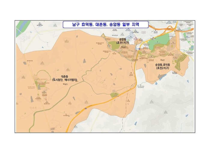 | ▲ 광주광역시 남구 효덕동, 대촌동, 송암동 등 일부 지역 흐린물 발생 예상지 위치도 / 광주광역시 제공 |