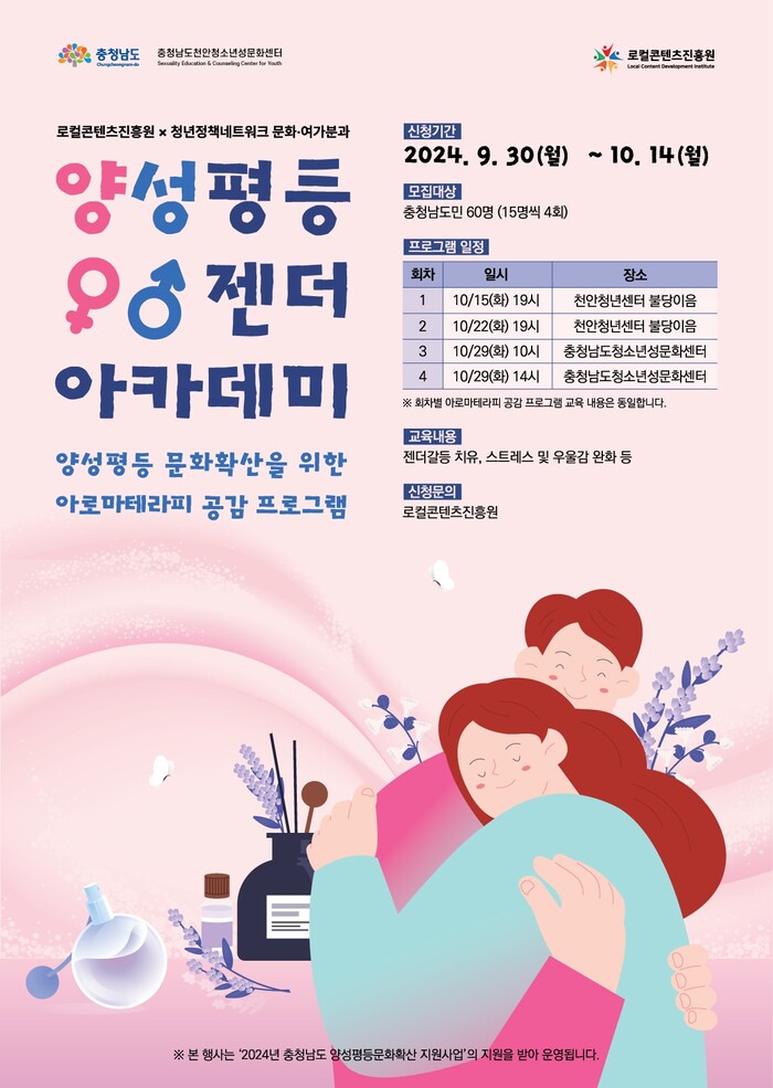 ‘양성평등 젠더아카데미’는 ‘2024년 충청남도 양성평등문화확산 지원사업’에 선정되어 운영되는 프로그램이다. 청년 및 중장년층을 대상으로 하며 아로마테라피 공감 프로그램을 통해 젠더 갈등을 치유하고 스트레스 및 우울감을 완화함으로써 양성평등 문화를 확산시키기 위한 목적으로 기획되었다.