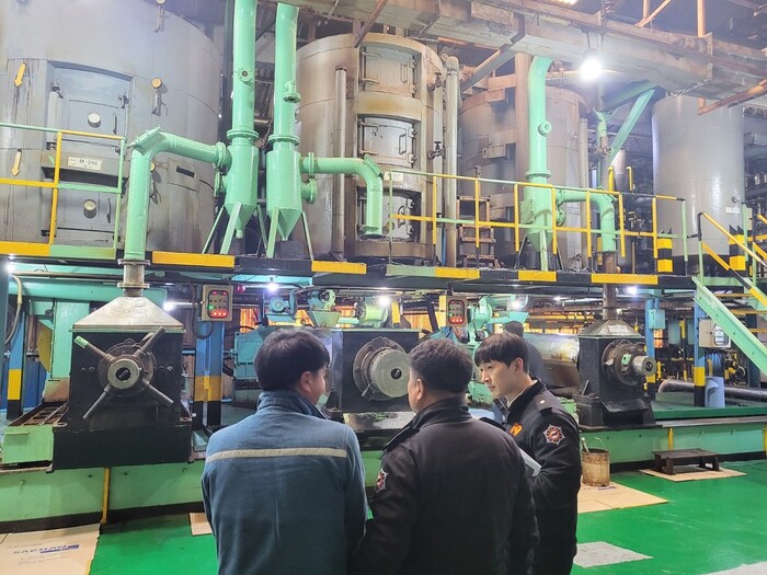 | ▲ 해남소방서 김승용 소방위(가운데)가 지난 14일 유맥 해남공장을 방문해 유맥 관계자를 대상으로 현장지도 및 시설을 점검하고 있다. / 해남소방서 제공 |