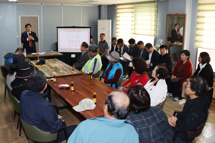 | ▲ 문경복 군수가 진촌6리 ‘리별속속마을간담회’에 참석해 주민들에게 현안에 대해 설명하고 있다. (사진=인천 옹진군청 제공) |