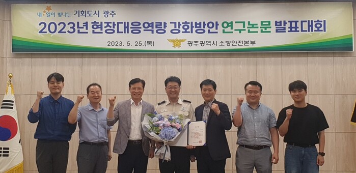 | ▲ 광주광역시 소방안전본부가 지난 25일 남부소방서 대회의실에서 개최한 '2023년 현장대응역량 강화방안 연구논문 발표대회' 에서 1등을 차지한 동부소방서 소방 관계 공무원들이 기념촬영을 하고 있다. / 광주광역시 제공 |