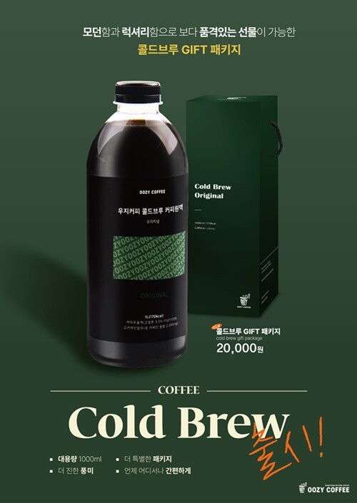 우지커피의 콜드브루 GIFT 패키지는 신선한 원두로 정성스레 추출한 콜드브루 커피를 담았다. 콜드브루는 상온이나 차가운 물에서 장시간 우려내 풍부한 바디감과 깊은 맛이 느껴지는 커피로 쓴 맛이 덜하고 부드러운 것이 특징이다.