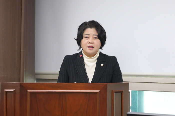 | ▲ 안산시의회 박은정 의원이 지난 24일 제3상임위실에서 열린 제302회 임시회 도시환경위원회에서 ‘안산시 지역건설산업 활성화 촉진 조례 일부개정조례안’에 대해 설명하고 있다 /사진제공=안산시의회 |