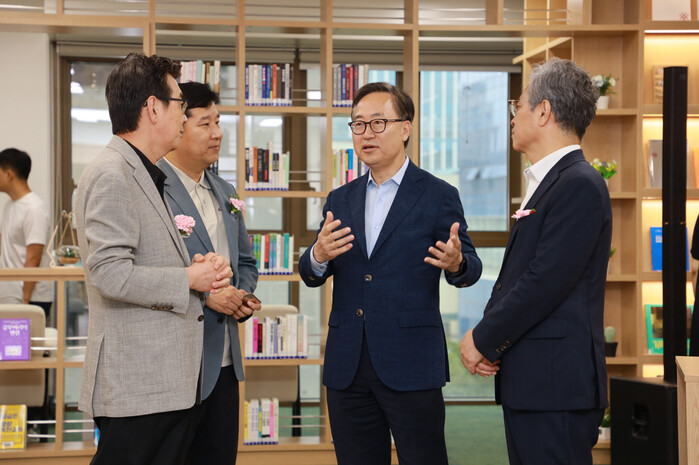 | ▲ 유 구청장이 ‘금천가산퍼블릭 디자인작은도서관’ 개소식에서 관계자들과 대화를 나누고 있다.(사진=금천구청 제공) |