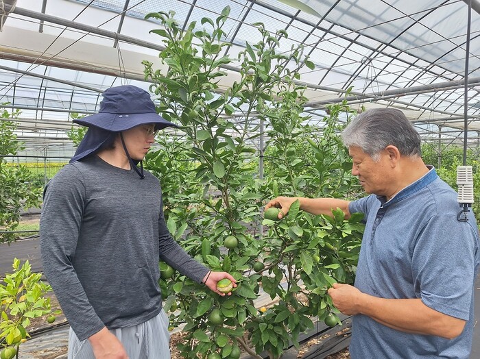 | ▲ 과수분야 김옥환 선도농가(오른 쪽), 신규 농업인에게 현장실습 교육 / 강진군 제공 |