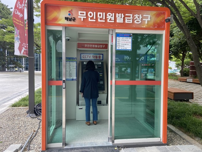 군청 무인민원발급기는 그동안 해남군민광장 조성공사로 인해 군청 로비에 임시 운영돼왔다. 야외인 군민광장으로 이전함으로써 야간과 공휴일에도 365일 24시간 언제든지 민원서류 발급이 가능해 민원접근성과 주민만족도가 개선 될 것으로 기대된다.
