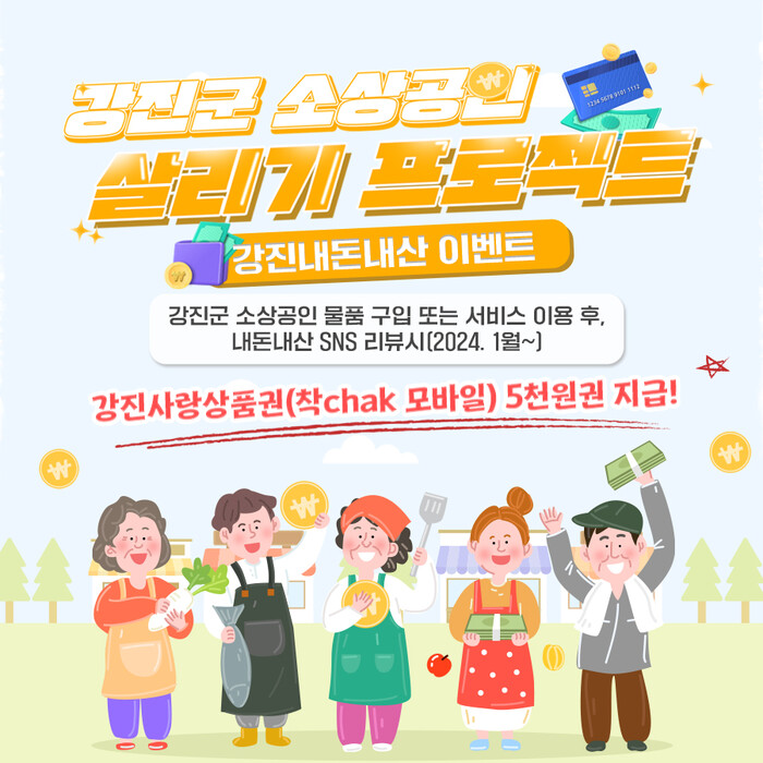 강진원 강진군수는 “2024 반값 강진 관광의 해를 맞아 강진군민뿐만 아니라 다른 지역에서 온 관광객들도 함께 참여하면 좋을 것”이라면서 “지역 경제 활성화의 중심인 관내 소상공인들의 온라인 홍보에 이은 매출을 늘릴 수 있는 소상공인 살리기 프로젝트에 많은 관심을 바란다”고 밝혔다.