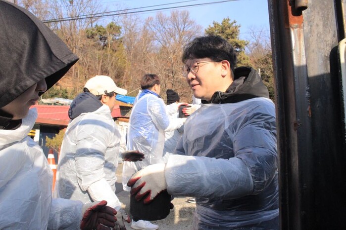 | ▲ 7일 오전 노송병원 노정호 병원장과 직원들이 연탄 나누기를 함께 하고 있다. (사진=노송병원 제공) |
