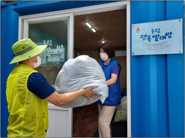 | ▲ 중림동 행복빨래방 도우미가 빨랫감을 전달받고 있다.(사진제공=서울 중구청) |