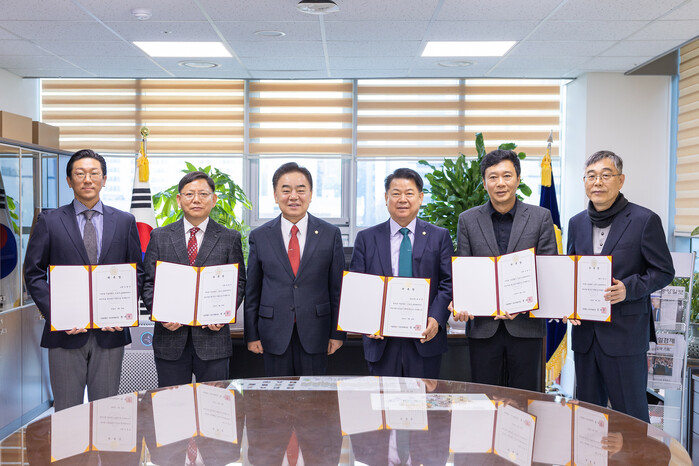 | ▲ 결산검사위원 위촉식에서 (왼쪽부터) 김병덕·박영진 위원, 정대근 의장, 변정열·김현석·신영기 위원이 기념촬영을 하고 있다. (사진=구로구의회 제공) |