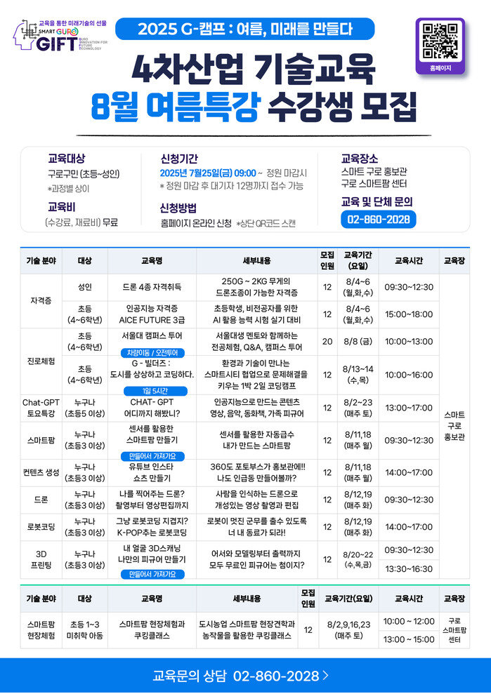[시민일보 = 박소진 기자] 구로구(구청장 장인홍)가 오는 25일부터 4차산업 기술교육 ‘2025 G-캠프 8월 여름특강’ 수강생을 선착순 모집한다.