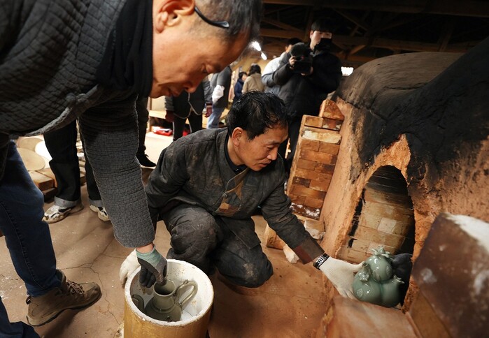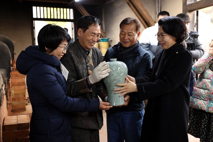 [강진=정찬남 기자] 1,300도를 견딘 천년 문화의 정수, 강진 청자가 출요돼 도예장인과 서순철 강진군부군수, 김보미 강진군의장 등이 완벽하게 구어진(번조) 운학무늬 매병을 살펴보고 있다.