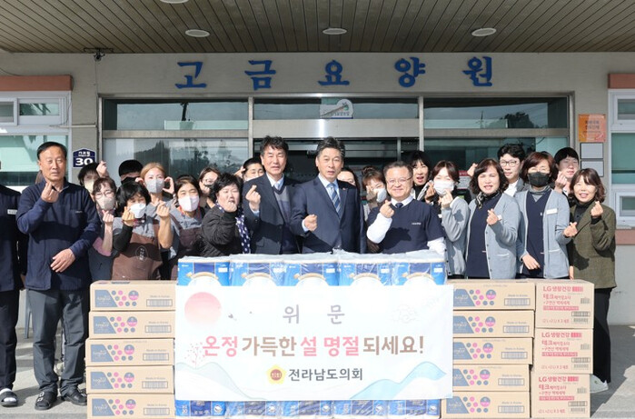 이철 전남도의회 부의장이 지난 4일 설 명절을 앞두고 완도군에 위치한 ‘청해요양원’과 ‘고금요양원’을 방문해 위문품을 전달하고 시설 관계자들과 현장 운영 관련 의견을 나눴다. 사진은 기념촬영을 하고 있는 모습. (사진= 전남도의회 제공)