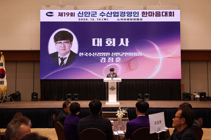 [신안=황승순 기자]신안군 수산업경영인연합회(회장 김정훈)는 지난 19일 남악 스카이웨딩홀에서 300여 명의 회원과 임원, 그리고 서삼석 국회의원, 박우량 신안군수, 김길동 신안군수산업협동조합장 등 내빈이 참석하여 ‘24년 한마음대회를 개최했다고 밝혔다.