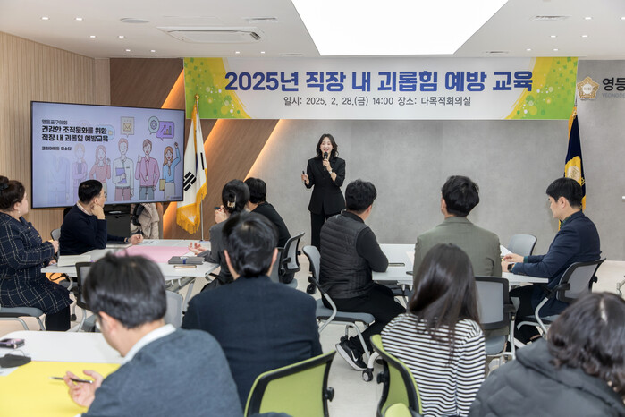 [시민일보 = 여영준 기자] 서울 영등포구의회(의장 정선희)가 최근 다목적회의실에서 사무국 직원을 대상으로 직장 내 괴롭힘 예방교육을 실시했다.