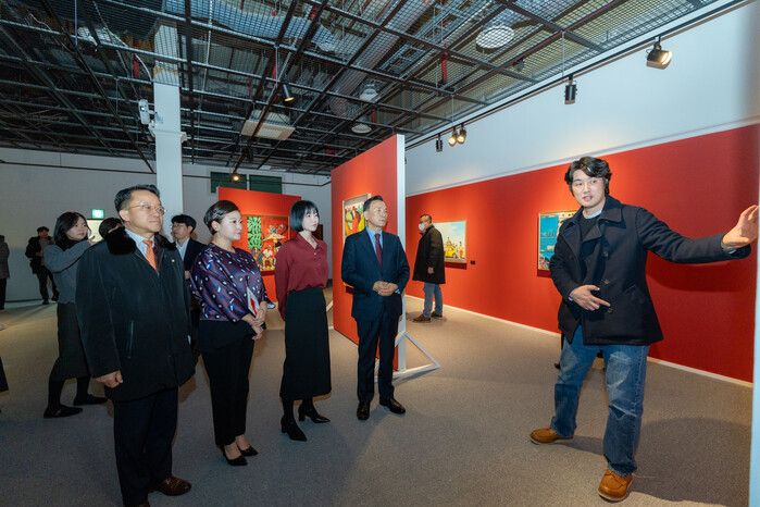 | ▲ 강남구의회 복지문화위원회 위원들이 전시장에서 전시 참여 작가의 설명을 청취하고 있다.(사진=강남구의회 제공) |