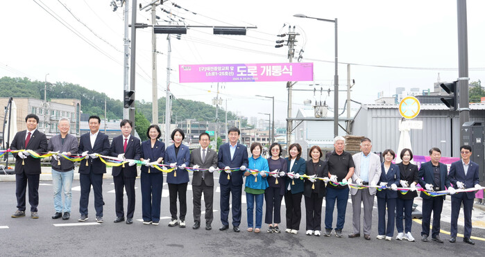 경기 광주시가 지난 25일 태전동 지역 교통 여건 개선을 위한 ‘(구)태전중앙교회 앞(소로1-25호선) 도시계획도로 개설 공사’ 개통식을 개최했다. 이날 개통식에는 방세환 시장을 비롯해 시의원, 지역 주민, 유관기관 관계자 등이 참석한 가운데 태전동 목리1교 일대에서 진행됐다. 사진은 방 시장(왼쪽 여덟 번째)이 기념 촬영을 하는 모습. (사진=광주시청 제공)