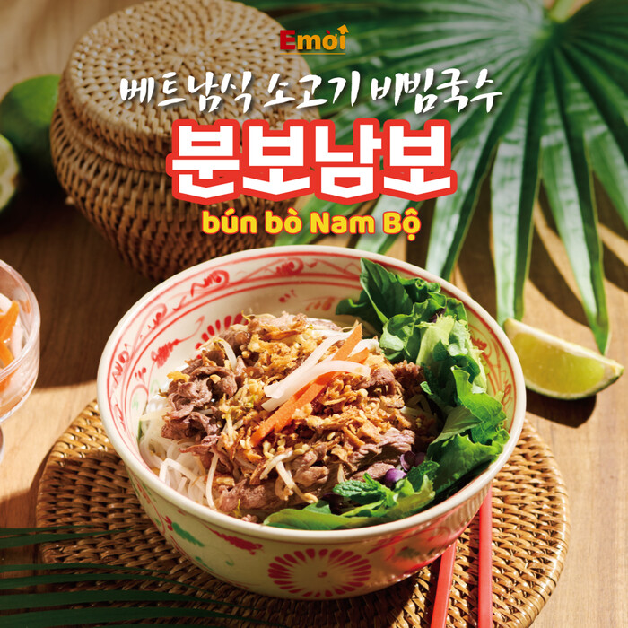 에머이 신제품 ‘분보남보’는 베트남 남쪽 지역의 음식으로 ‘분’은 얇은 쌀국수의 종류를 ‘보’는 소고기를 뜻하며, 온기가 느껴지는 소스와 숙주, 당근, 양상추, 땅콩분태, 마늘 후레이크 등 각종 야채와 함께 비벼먹는 소고기 비빔 국수이다.