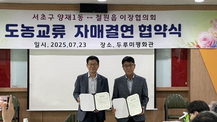 [시민일보 = 박소진 기자] 서초구(구청장 전성수) 양재1동은 23일, 철원읍과 도농 상생발전을 위한 자매결연 협약을 맺고, 문화‧관광‧농특산물‧경제 등 분야에서 협력 의지를 다졌다.