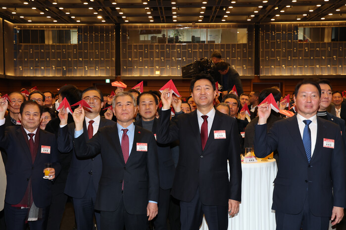 | ▲ 김현기 서울시의회 의장이 신년인사회에서 참석자들과 함께 종이비행기를 날리고 있다. (사진=서울시의회 제공) |