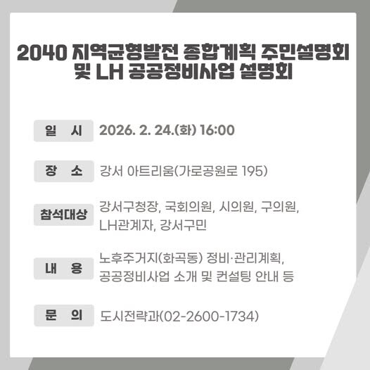 [시민일보 = 박소진 기자] 강서구(구청장 진교훈)는 오는 24일 오후 4시 강서아트리움(가로공원로 195)에서 지역 균형발전을 위한 주민설명회를 개최한다.
