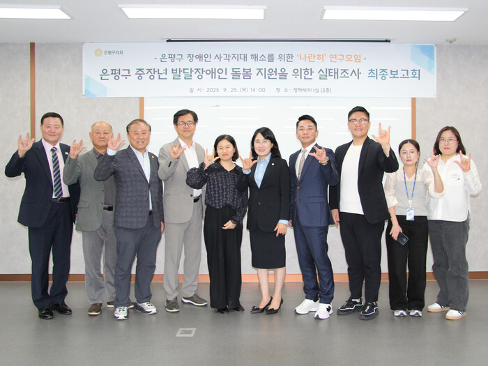[시민일보 = 이대우 기자] 서울 은평구의회(의장 송영창) 의원연구단체 ‘은평구 장애인 복지 사각지대 해소를 위한 나란히 연구모임’이 최근 ‘중장년 발달장애인 돌봄 지원을 위한 실태조사 연구용역’ 최종보고회를 열고 지난 5개월간의 연구성과와 정책 제안을 발표했다.