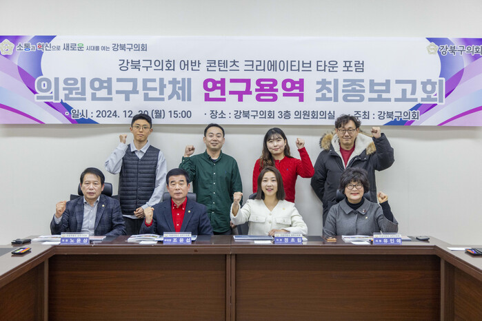 [시민일보 = 문민호 기자] 서울 강북구의회(의장 김명희) 의원연구단체인 ‘어반 콘텐츠 크리에이티브 타운 포럼’은 최근 의회 3층 의원회의실에서 '연구용역 최종보고회'를 개최했다고 8일 밝혔다.