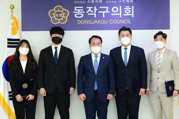 [시민일보 = 여영준 기자] 서울 동작구의회(의장 전갑봉)가 최근 의장실에서 신규 채용한 4명의 정책지원관에게 임용장을 수여했다.